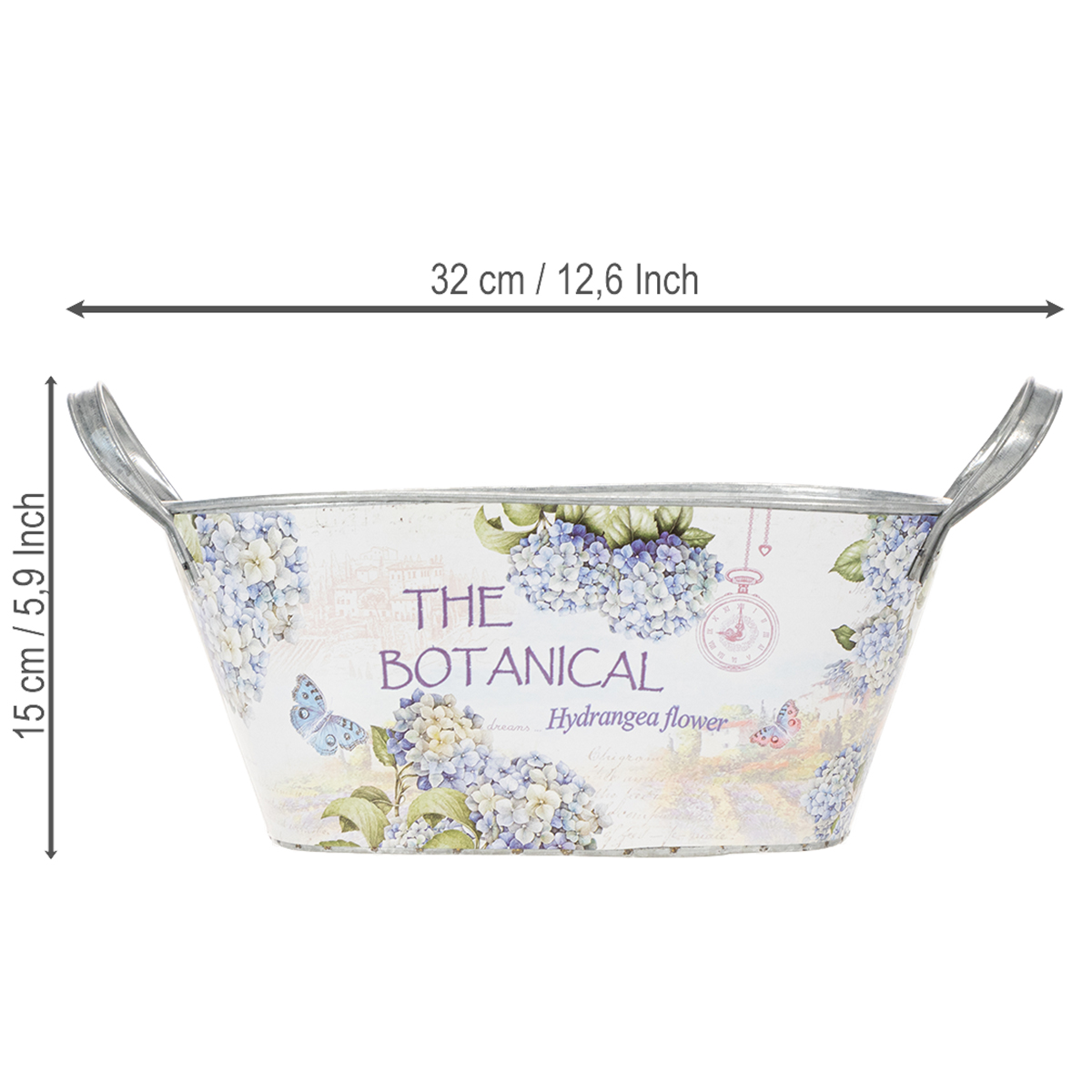 Metalinis gėlių dubuo su rankenomis su detaliu mėlynų hortenzijų raštu nukelia jus į svajingą gėlių sodą.