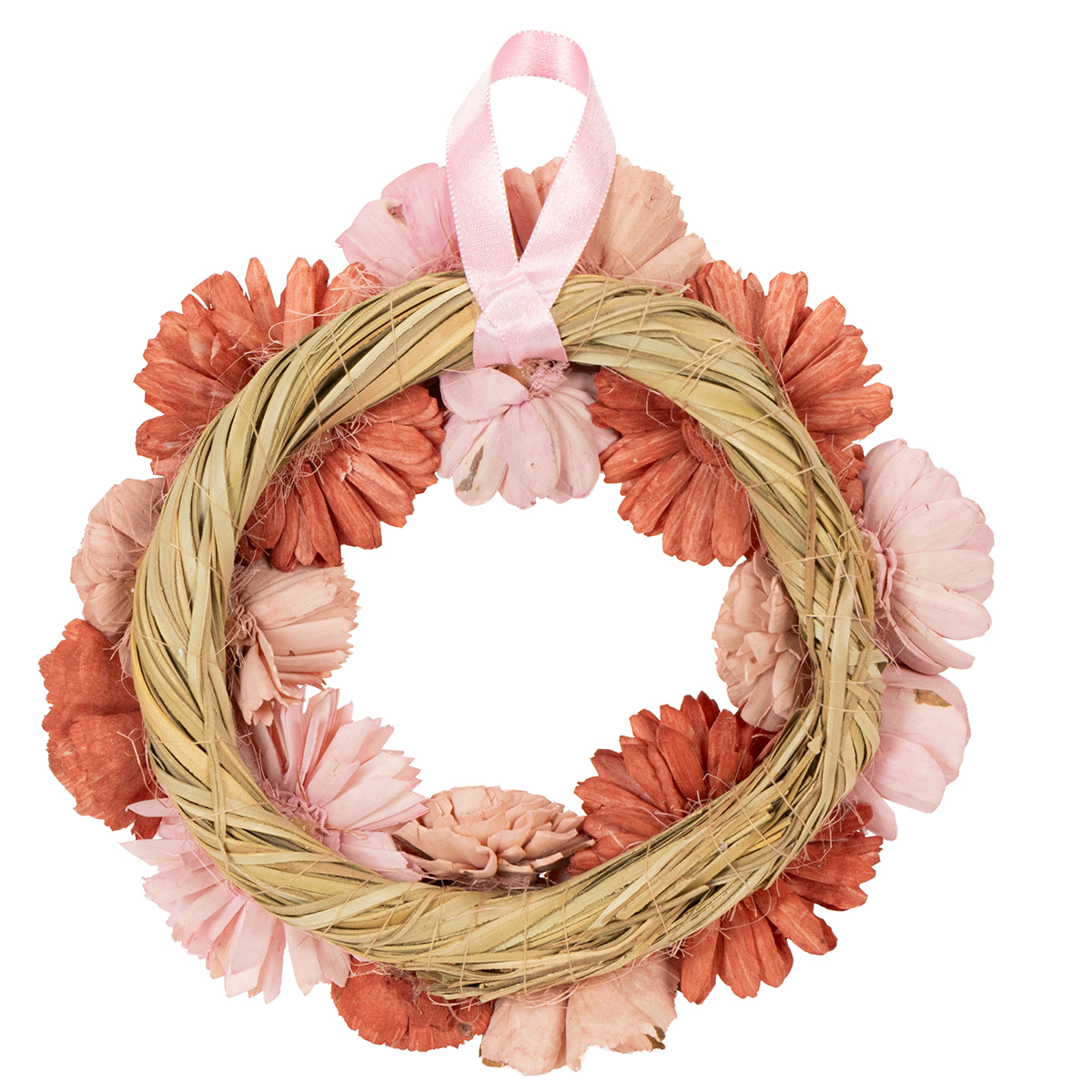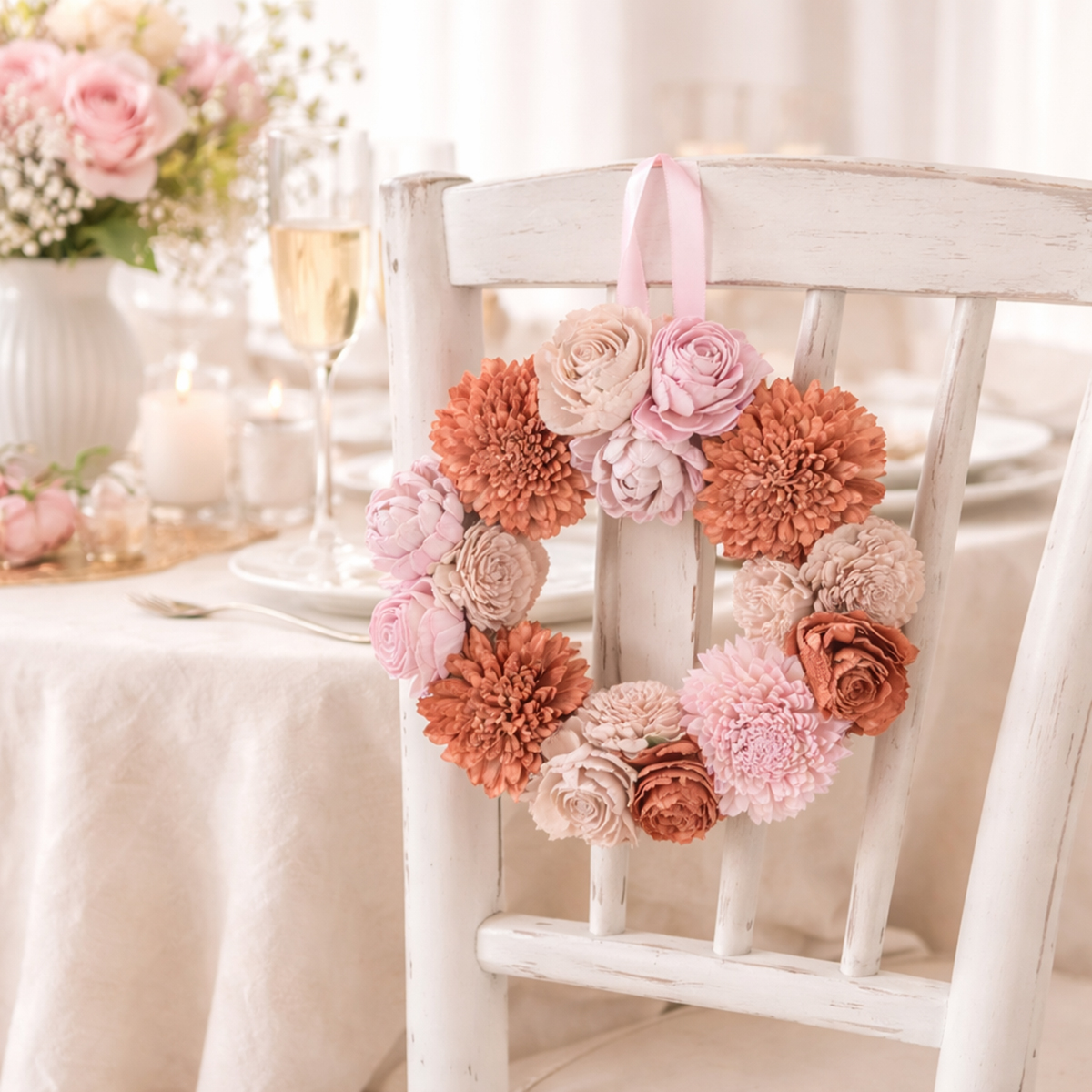 Šis gėlių vainikas iš pirmo žvilgsnio sužavi harmoningu švelniai rožinės spalvos deriniu. Iš aukštos kokybės sola medienos kruopščiai pagaminti smulkūs žiedai suteikia tikroviško, tačiau unikalaus žavesio, kuris suteiks ilgalaikio džiaugsmo. Tokie pakabinami gėlių vainikai puikiai tinka ne tik svetainės sienai puošti, bet ir kaip stalo dekoracija ypatingomis progomis. Jis greitai taps tikru jūsų vestuvių ar pavasario vėlyvųjų pusryčių akcentu.
