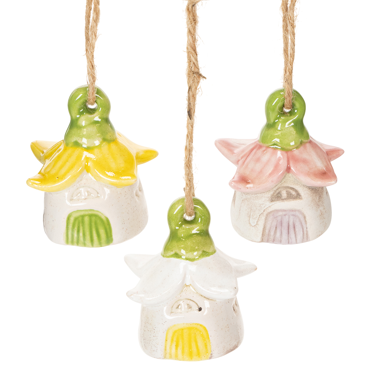 Produkto pavadinimas: Pakabinamos dekoracijos gėlės keraminiai fėjų nameliai kaip dekoracija pakabinimui 6 cm 6 vnt.