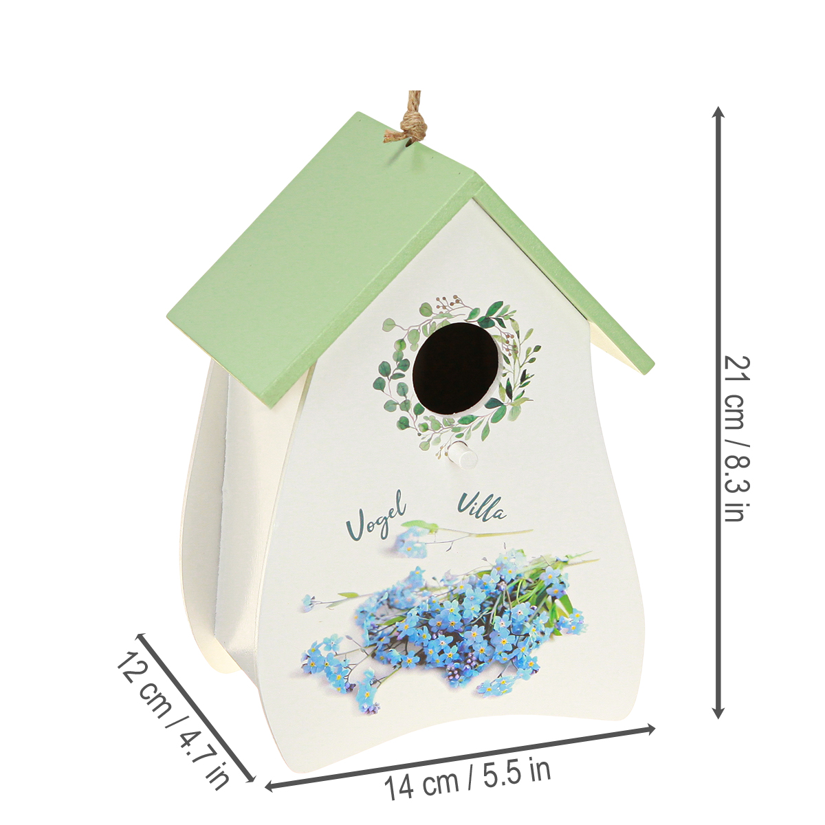 Šis paukščių namelis – ne tik dekoratyvinis elementas; tai mažas lobis visiems, vertinantiems žavingas detales. Gaiviai žalias stogas puikiai dera su švelniai balta medinio fasado spalva, papuošta subtiliais gėlių motyvais. Jis primena jaukių kaimo sodybų žavesį ir sklandžiai dera prie vintažinio ar kaimiško dekoro. 21 centimetro aukščio namelis puikiai atrodo ant bet kurios palangės ar sienos, akimirksniu traukdamas akį. O geriausia dalis? Jis yra grynai dekoratyvus, todėl idealiai tinka naudoti patalpose. Aiškiai matomas su meile atliktas meistriškumas, todėl kiekvienas paukščių namelis yra unikalus. Jis ypač žavus pavasarį ir vasarą: pastatykite jį priešais vazą su šviežiomis gėlėmis arba pridėkite šį žavų akcentą prie savo pavasarinio stalo serviravimo. Ir būkime atviri, kas nemėgsta šiek tiek daugiau gėlių grožio ir natūralių elementų savo namuose? Namų pertvarkymas – vienas juokas: tiesiog atidarykite galinę durelę, pridėkite smulkių aksesuarų ar gėlių kompozicijų, ir namas akimirksniu sužibės nauja, gaivi išvaizda. Namelis taip pat puiki idėja kaip ypatinga dovana, nes jis yra individualus, praktiškas ir nesenstantis.