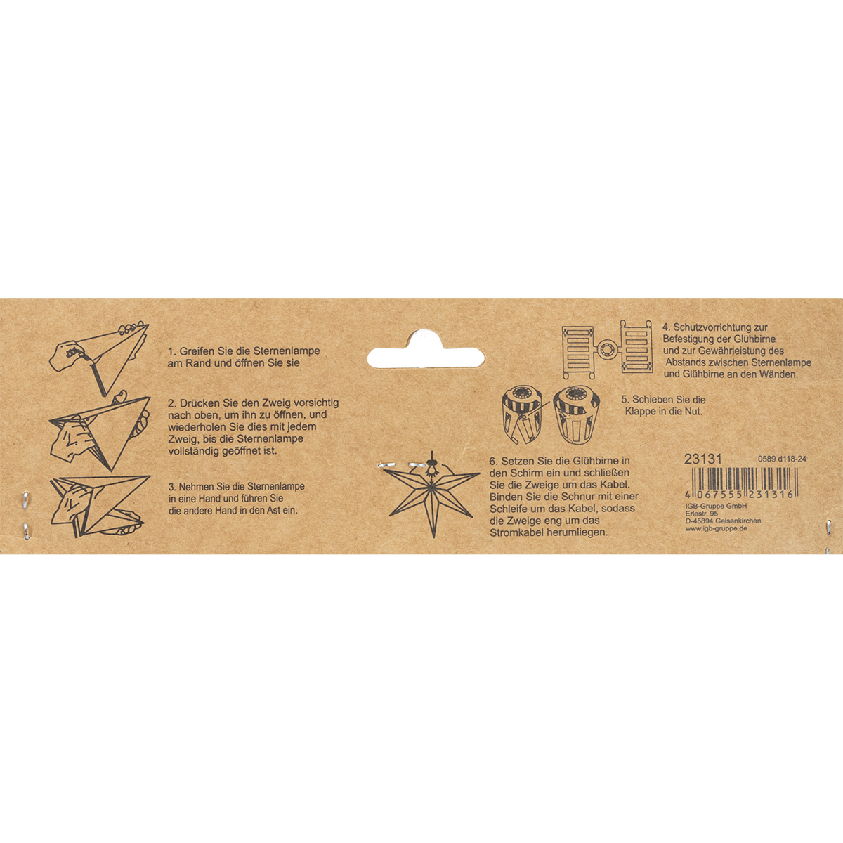 Specialus privalumas: žvaigždė tinka apšvietimui (apšvietimo sistemos neįskaičiuotos). Vakare popierinė žvaigždė paverčiama stebuklinga žvaigždės formos lempa, skleidžiančia švelnią šviesą ir sukuriančia raminančią atmosferą. Tiesiog nuostabu įnešti Kalėdų magijos į jūsų namus! Žvaigždė skirta ne tik Kalėdoms; ją taip pat galima naudoti kaip paprastų šventinių dekoracijų dalį, bohemiškam stiliui ar romantiškoms progoms, pavyzdžiui, vestuvėms. Papildykite ją natūraliomis medžiagomis, tokiomis kaip eglės šakos ar medinės žvaigždės iš Floristik24 parduotuvės!