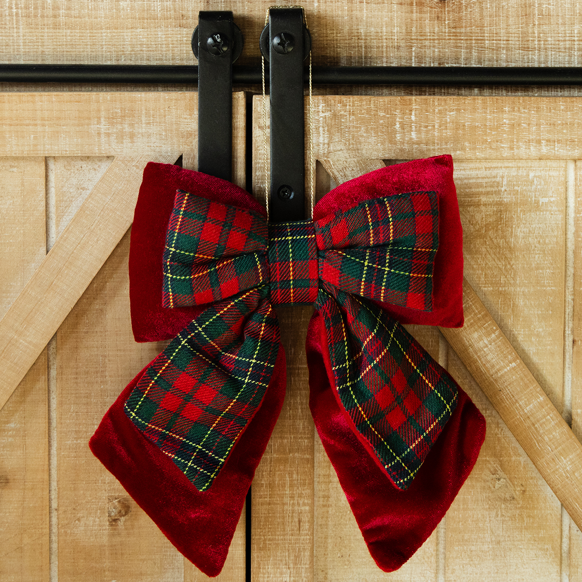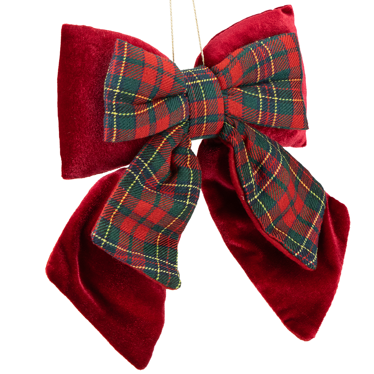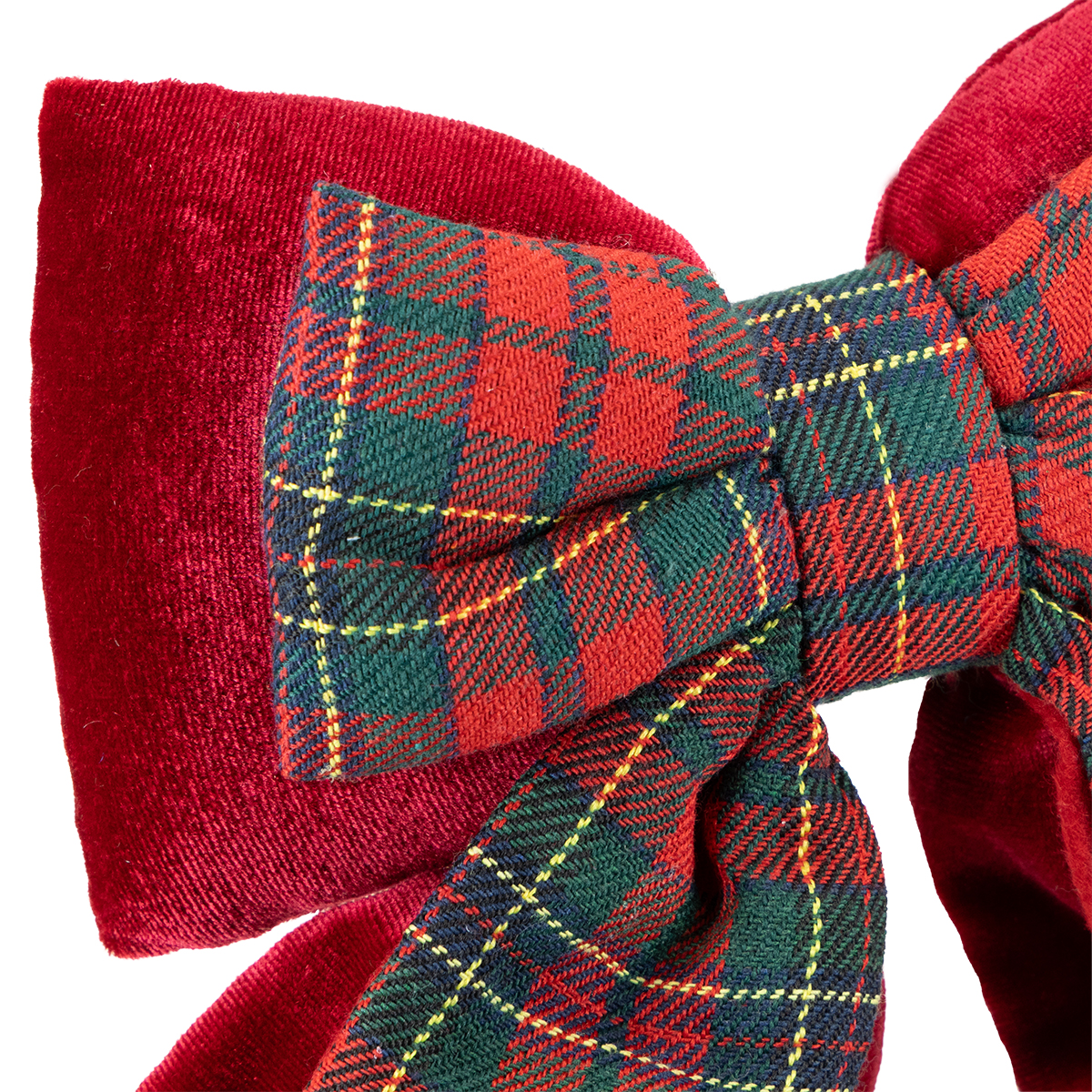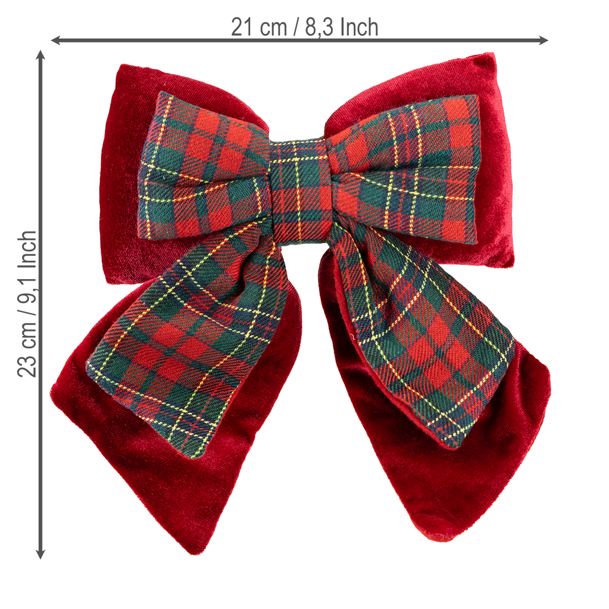 Raudonas aksominis kaspinas ir kiek mažesnis dekoratyvinis kaspinas su škotų languotu raštu derina estetiką ir funkcionalumą. Ryškus aksominis audinys susitinka su nesenstančiu languotu raštu, kartu sukurdami klasikinių kalėdinių spalvų kontrastą ir harmoniją. Maždaug 21 x 23 cm dydžio kaspinas nėra nei per didelis, nei per mažas – kaip tik tinkamo dydžio stilingam akcentui sukurti. Kamšalu užpildytas kaspino vidus užtikrina, kad jis tvirtai laikytųsi savo vietoje – nesvarbu, ar pritvirtinsite jį prie vainiko, ar naudosite kaip durų puošmeną, ar dekoruosite juo sienas ir langus.