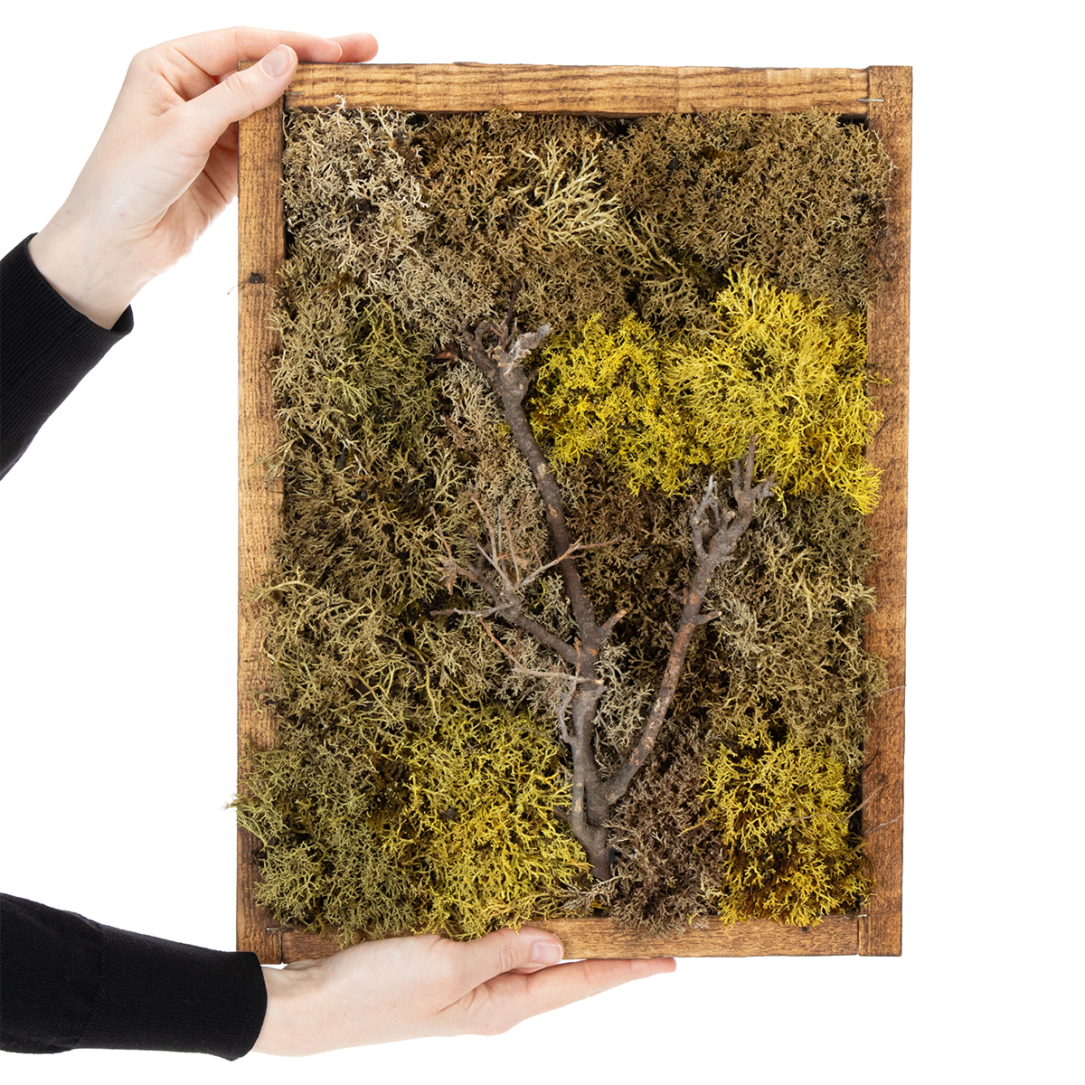 Atraskite raminamąjį tikrų samanų poveikį stilingame rėmelyje. Mūsų išsaugotas samanų paveikslas yra puiki žalia sienų puošmena bet kokiam kambariui – ar tai svetainė, biuras ar meditacijos kambarys. Su unikaliu skirtingų žalios spalvos atspalvių ežiuko samanų raštu ir centriniu šakos motyvu samanų meno kūrinys trauks akį jūsų interjere.