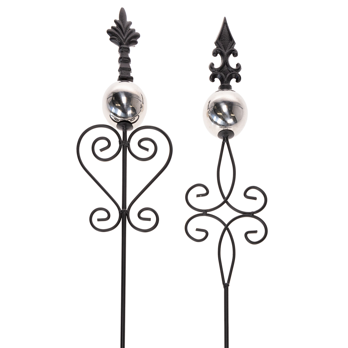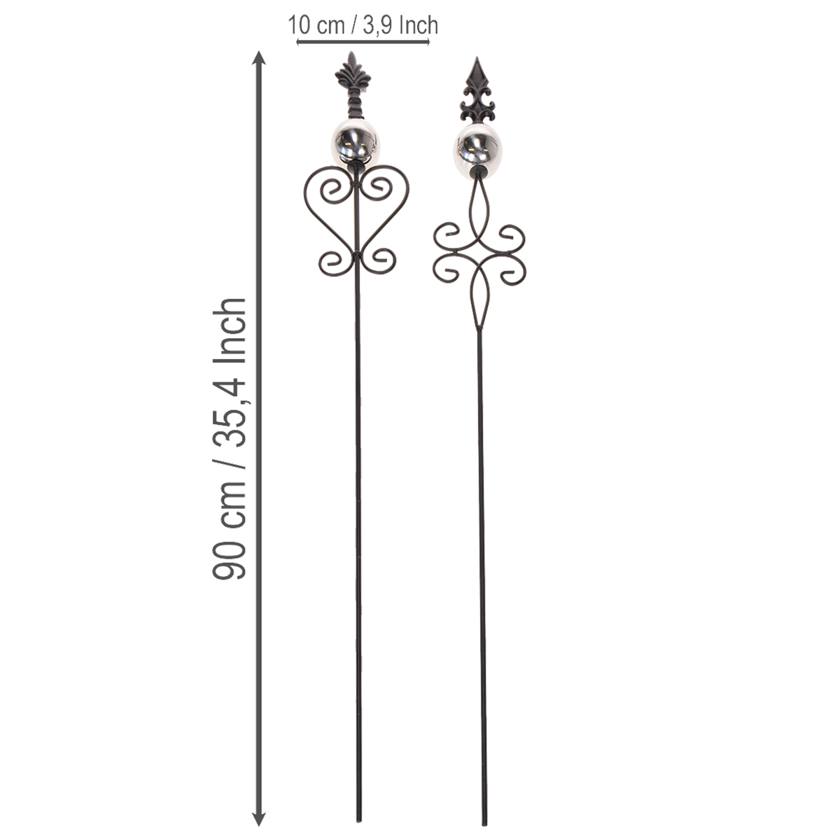 Suteikite savo sodui elegancijos ir stiliaus! Šie dekoratyviniai metaliniai sodo kuolai pavers bet kurią gėlyną ar sodo taką puošmena. Puošnus dizainas ir dekoratyvinė metalinė sfera sukuria modernų, kaltinės geležies įvaizdį, kuriame dera nostalgiškas žavesys ir nesenstanti estetika. Kiekvienas kuolas yra 90 centimetrų aukščio ir parduodamas praktiškame dviejų kuolų rinkinyje su dviem skirtingais dizainais – puikiai tinka suasmeninti jūsų lauko erdvę!