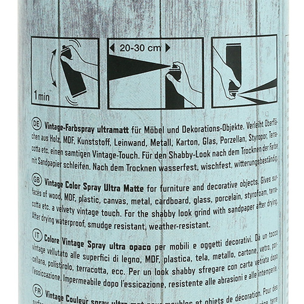 Šis šviesiai mėlynas „Vintage“ spalvos purškiklis primena gražiausią pavasario ar vasaros dangų, todėl tinka įgyvendinti daugybę kūrybingų dizaino ir dekoravimo idėjų. Nesvarbu, ar naudosite aplinkai nekenksmingus purškiamus dažus ant drobės, metalo, medžio, porceliano ar kartono – šios ir daugelis kitų medžiagų dera su spalvotu purškikliu, kad jūsų fantazijai nebūtų ribų!