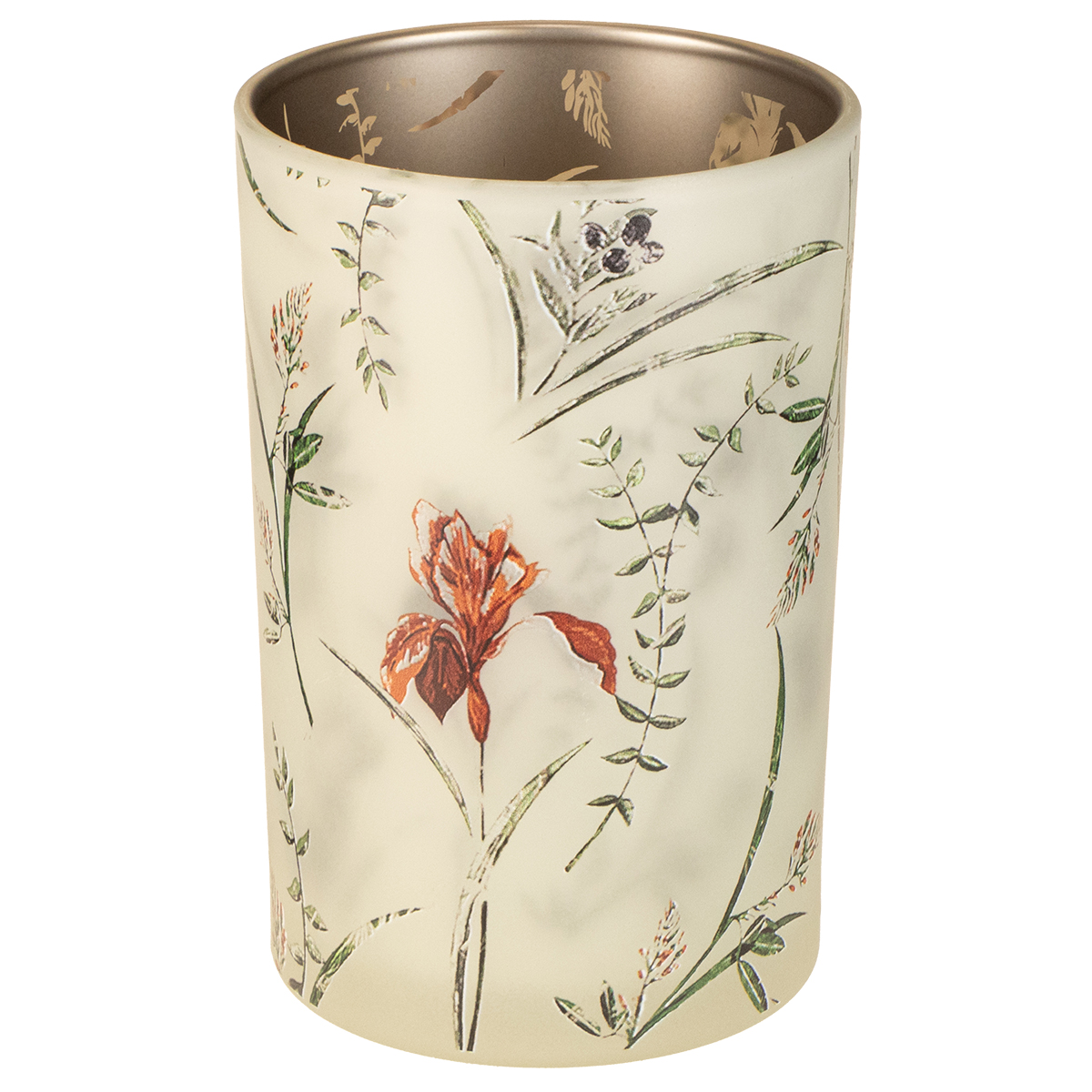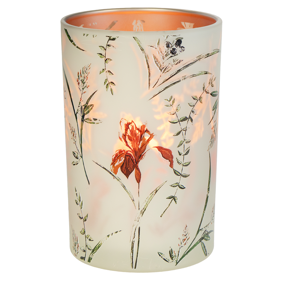 Stiklinė arbatinė žvakutė, gėlių raštas jaukioms akimirkoms namuose, 18 cm