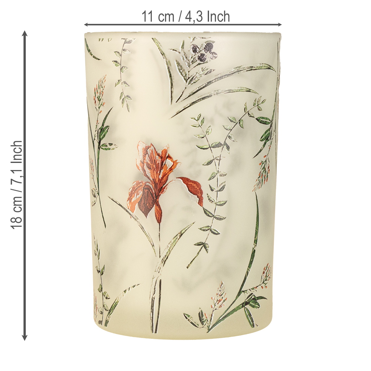 Stiklinė žvakidė su gėlių raštu yra daugiau nei tiesiog žvakidė – tai išskirtinis jūsų namų aksesuaras. Subtilus smėlio, žalios ir raudonos spalvų gėlių raštas suteikia jai natūralią ir harmoningą išvaizdą, kuri puikiai dera prie vintažinio ar kaimiško stiliaus dekoro. Rankų darbo dizainas užtikrina, kad kiekviena žvakidė yra unikali. 18 cm aukščio ir 12 cm skersmens joje yra daug vietos tiek standartinėms žvakutėms, tiek dekoratyvinėms žvakėms. Aukštos kokybės stiklas praleidžia šviesą ir šilumą gražiai – šis efektas ypač magiškai atrodo prieblandoje.