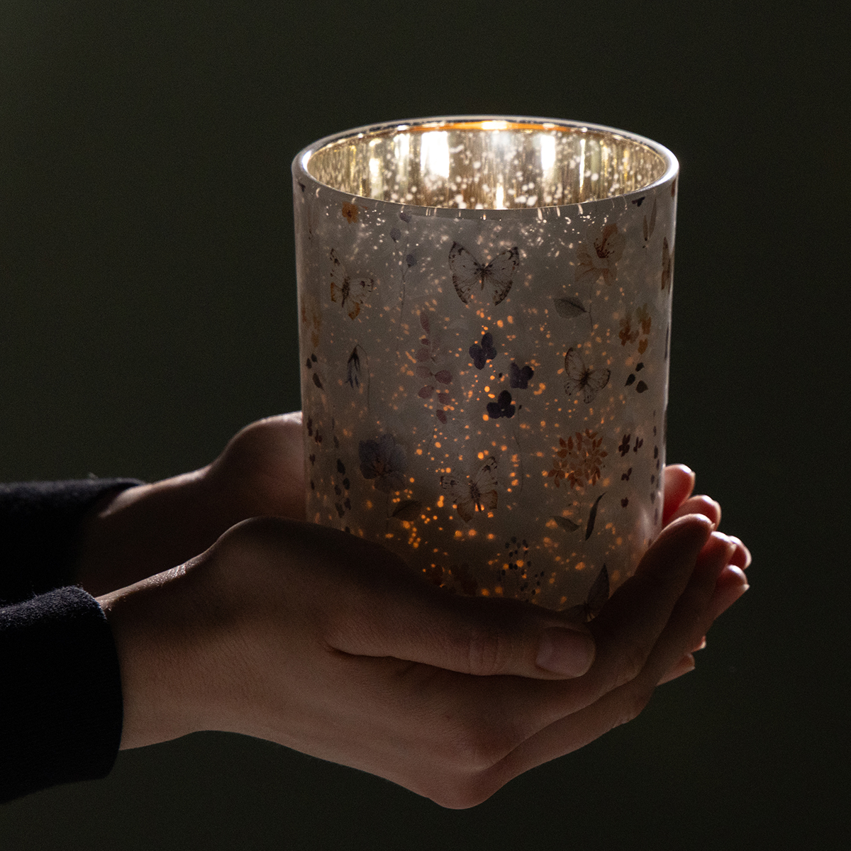 Drugelio motyvas suteikia bet kokiam kambariui lengvumo ir gaivos atmosferą. Žvilgančio auksinio atspalvio vidus švelniai atspindi žvakių šviesą, sukurdamas nuostabiai šiltą švytėjimą – idealiai tinka atpalaiduojantiems vakarams. Subtilus meistriškumas, naudojant aukštos kokybės stiklą, daro šias žvakides patvarias ir universalias, neatrodydamos sunkios.