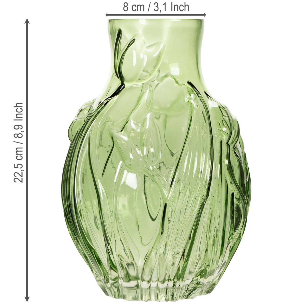 Ar kada nors matėte tokią žavią ir stilingą vazą, kurią tiesiog privalote turėti? Mūsų žalio stiklo tulpių vaza su reljefiniu tulpių raštu gali būti kaip tik tas perlas jūsų namams. Patraukli žalia spalva ir puikiai apgalvota forma derina nesenstantį dizainą ir funkcionalumą. Nesvarbu, ar pastatysite ją ant indaujos, valgomojo stalo, ar miegamajame, ši vaza garantuotai pritrauks akį!