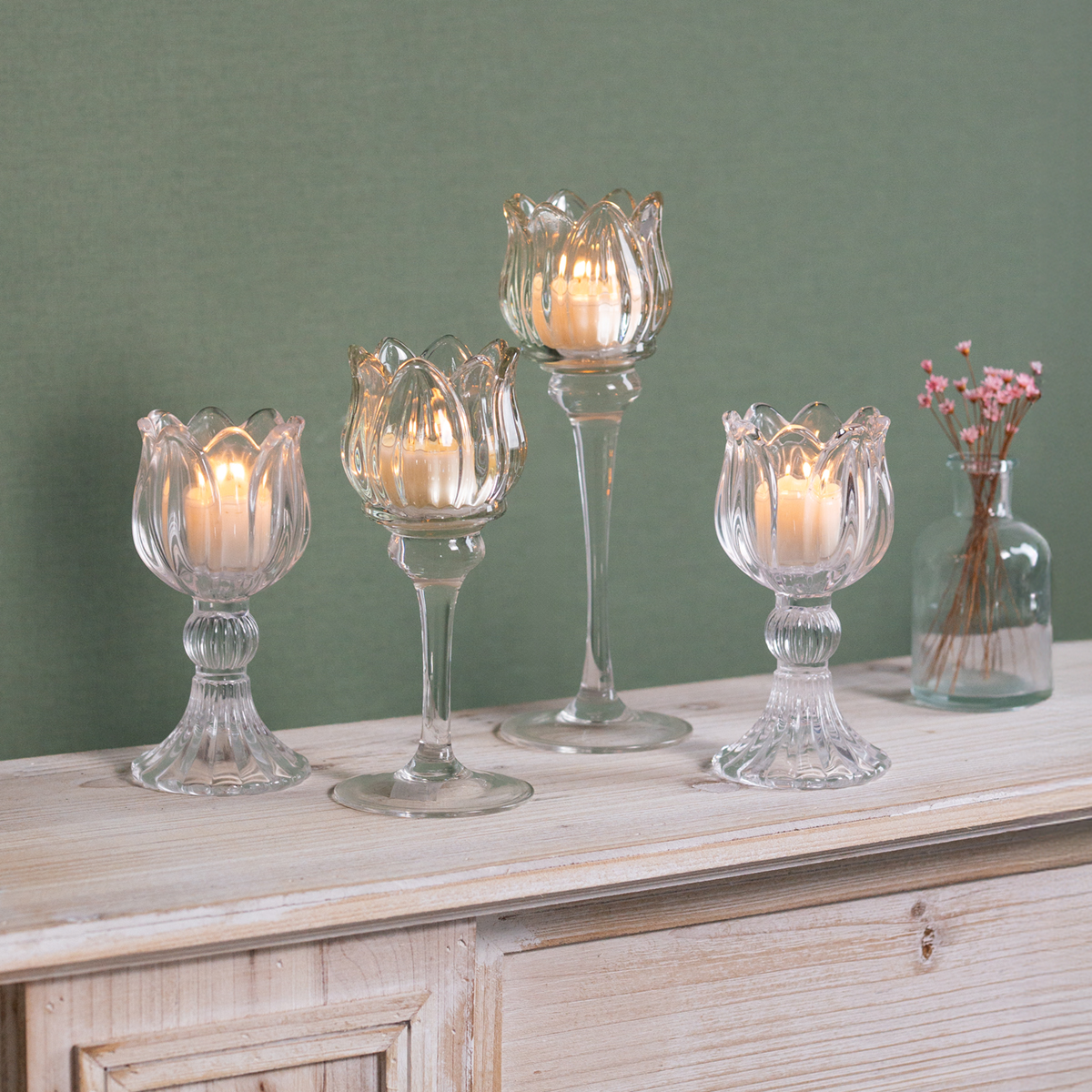 Stiklinės žvakidės stalo dekoracija – elegancija gėlių formoje