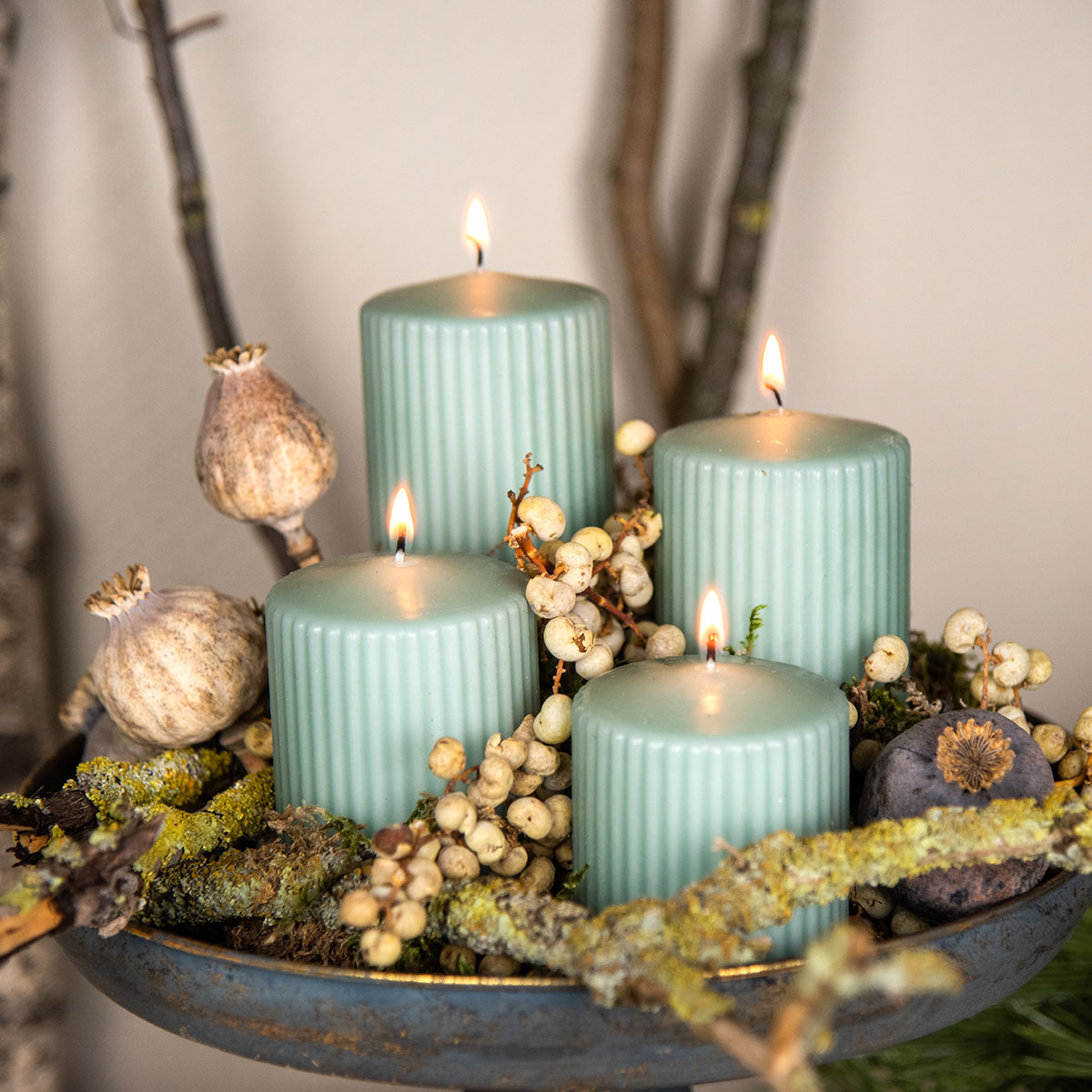 Šalta smaragdo žalia dera su daugybe originalių dekoravimo idėjų. Nesvarbu, ar žvakes su grioveliais derinsite su baltais, auksiniais, šviesiai mėlynais ar juodais aksesuarais, šios stulpinės žvakės visada spinduliuoja elegancija.