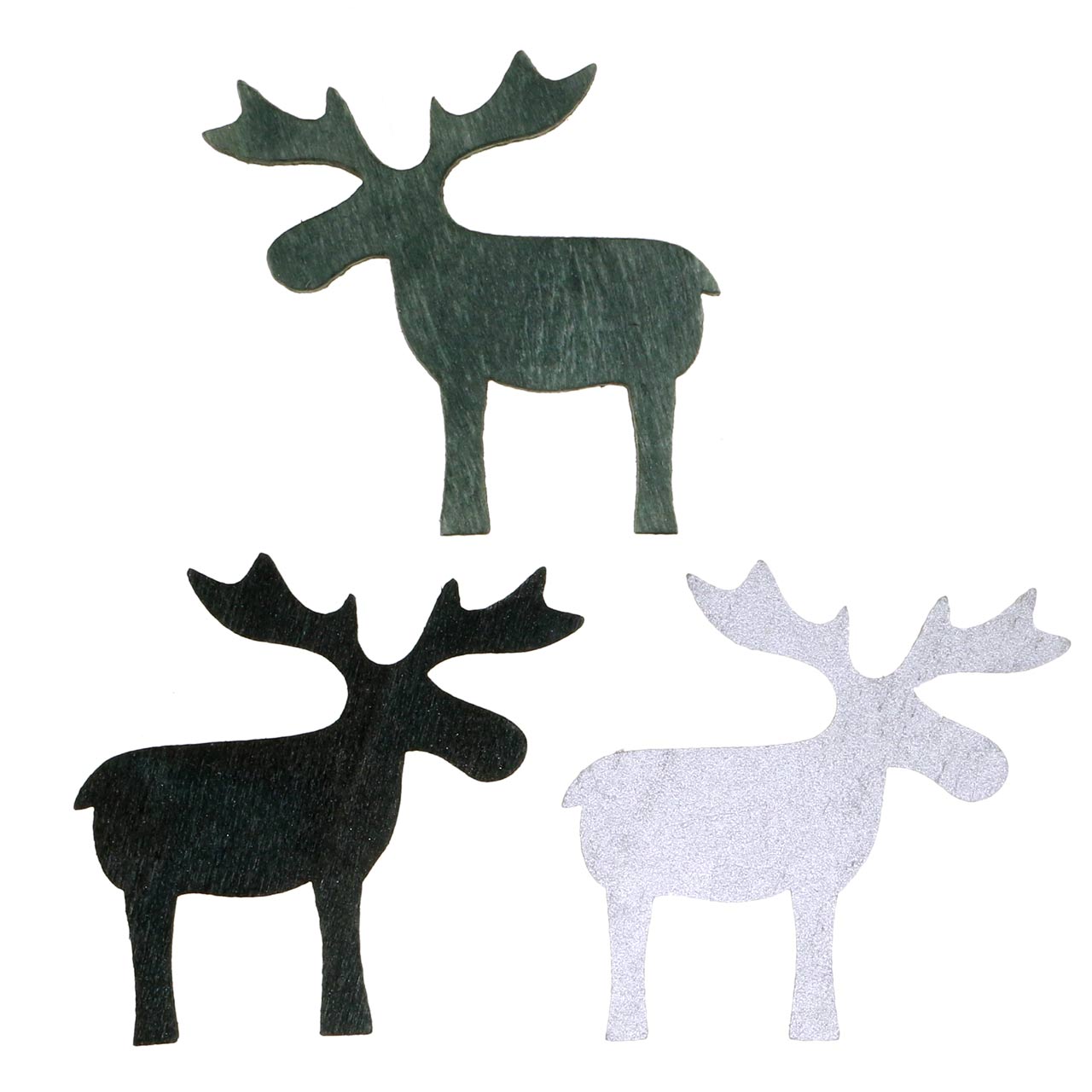 Mediniai šiauriniai elniai, skirti barstymui, yra 72 vienetų rinkinyje plastikinėje dėžutėje. Rinkinyje gausite išsklaidytą trijų spalvų dekoraciją, išrūšiuotą juodos, sidabrinės ir tamsiai pilkos spalvos - 24 vnt. Šiaurinių elnių storis yra apie 1,5 milimetro sidabro spalvos ir apie 2,5 milimetro juodos ir tamsiai pilkos spalvos, aukštis yra apie 38 milimetrai visų spalvų, o plotis apie 40 milimetrų.