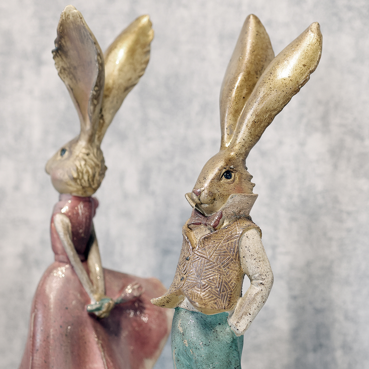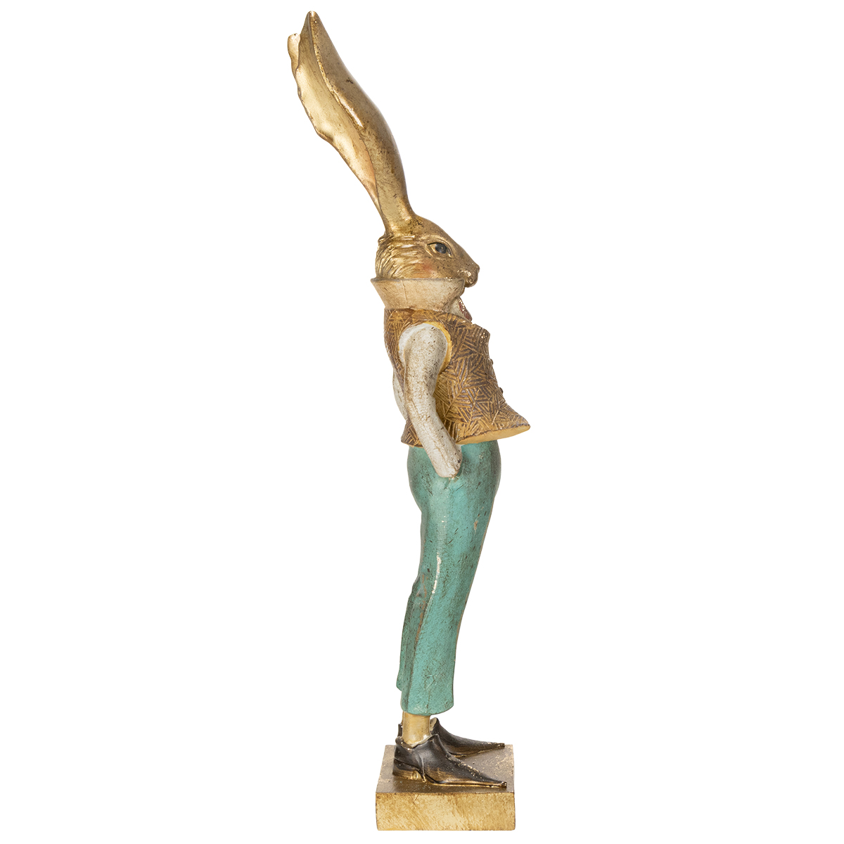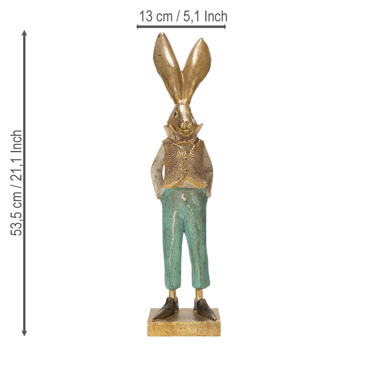Ši triušio figūrėlė žavi harmoningai suderintu dizainu. Šiltai rudas kūno atspalvis ir subtili žalia kelnių spalva sukuria malonų kontrastą, kuris atrodo ir modernus, ir nesenstantis. Ypač poliruotos poliaktono detalės suteikia šiai figūrėlei gyvybingą ir tikrovišką išvaizdą. Ar pastebėjote, kaip meiliai išdėstytos smulkios detalės? Nuo žavingos veido išraiškos iki auksinių akcentų ant jos aprangos – čia klasikinė velykinė puošmena dera su moderniu prašmatnumu.