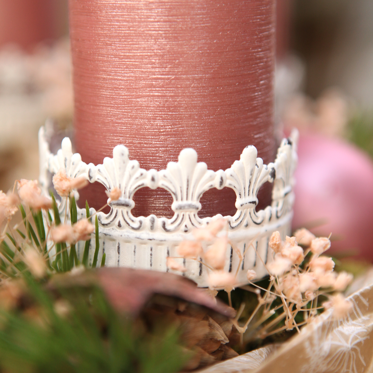 Tiesiog įstatykite žvakidę į gėlių kompoziciją su pastelinių spalvų gėlėmis ir mažomis šakelėmis, dekoruotomis nėriniais, kad sukurtumėte unikalų ir nostalgišką papuošalą, kurį galėsite pastatyti jaukiuose namuose, pavyzdžiui, ant indaujos ar valgomojo stalo centre. Žvakidė taip pat puikiai tinka romantiškai vestuvių dovanai arba atrodo nuostabiai pati su storesne, spalvinga žvake.
