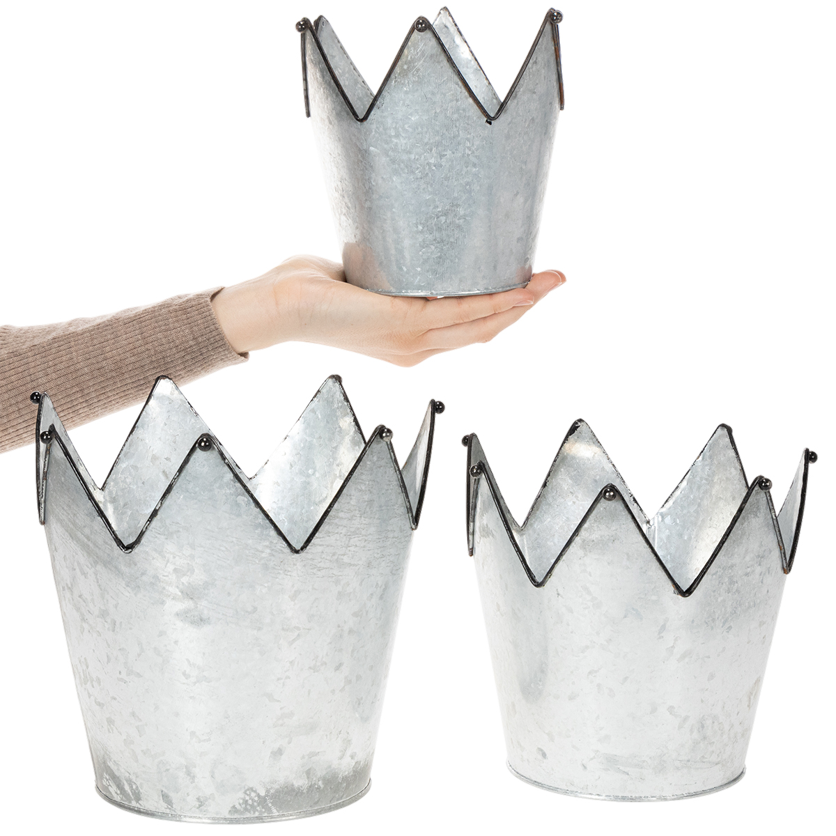 Patobulinkite savo palanges ir komodas su šiais trimis karūnos formos vazonais! Dekoratyvinės karūnėlės pagamintos iš metalo, tiksliau cinko.