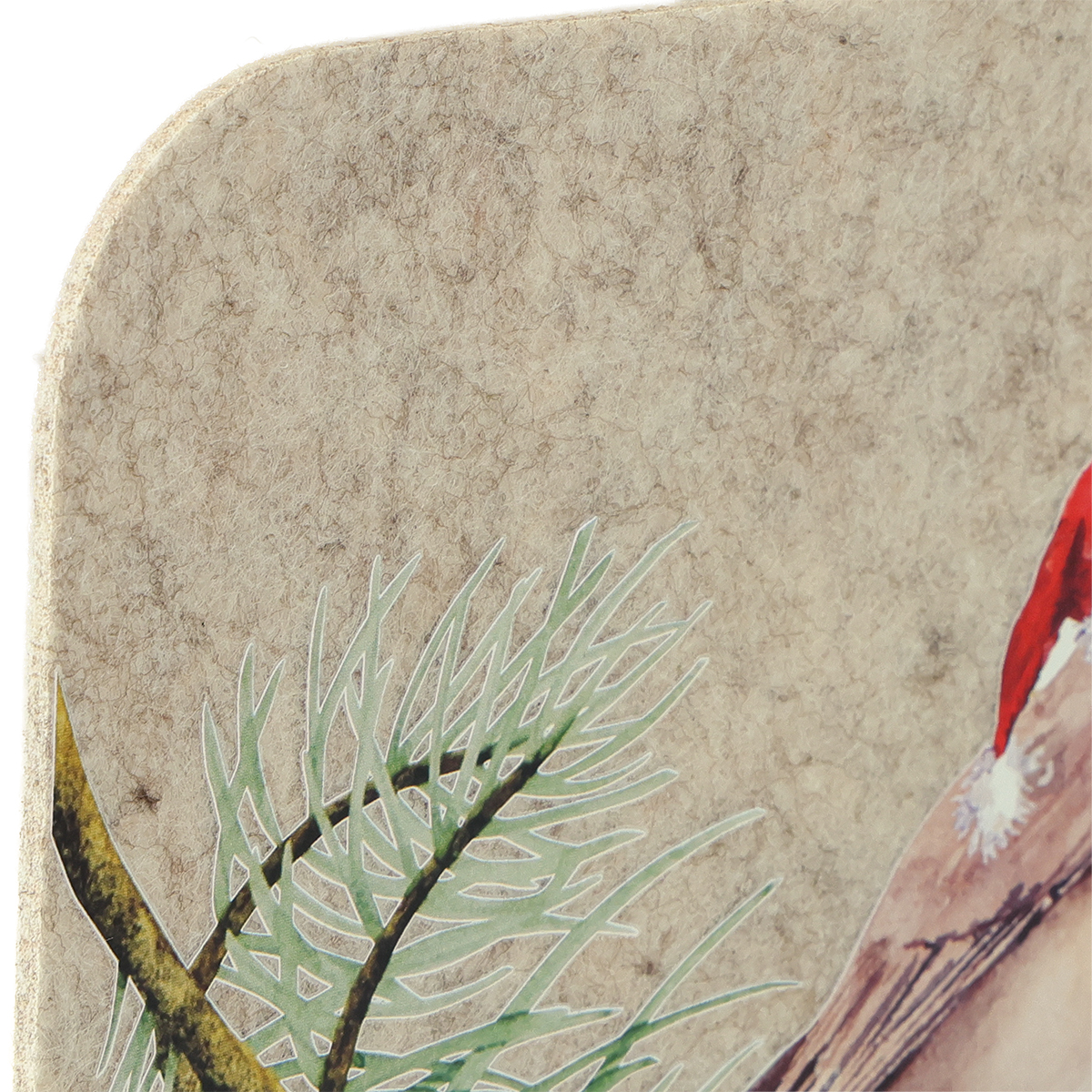 Šis padėkliukas – puikus pasirinkimas visiems, norintiems sukurti jaukią, bet elegantišką atmosferą. Padėkliukas, pagamintas iš aukštos kokybės smėlio ir pilkos spalvos veltinio, yra malonaus pojūčio ir paprastos elegancijos, puikiai papildančios kalėdinę dekoraciją. Ypač žavus mažo raudonviršio, dėvinčio Kalėdų Senelio kepuraitę ir tupinčio ant pušies šakos, raštas. Šis žaismingas, bet stilingas motyvas suteiks džiaugsmo jūsų stalui, nebūdamas pernelyg įkyrus. Kita pusė lieka be rašto, todėl galite naudoti padėkliuką tiesiog kita puse į viršų – universalus elegancijos derinys viename rinkinyje!