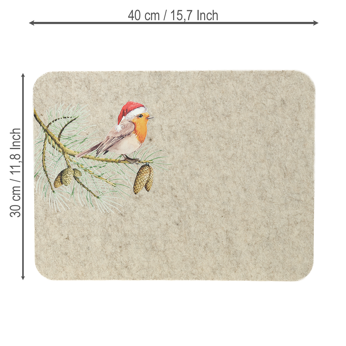 Kas galėtų padaryti Kalėdų vakarienę dar svetingesnę ir šventiškesnę? Taip, stilingas stalo serviravimas su mūsų veltinio kilimėliu su raudongurklio atvaizdu! Pilko veltinio ir žavingo raudongurklio motyvo derinys ant padėkliuko sukuria šilumą ir eleganciją alsuojančią atmosferą. Šis žavus aksesuaras yra ne tik puiki akims, bet ir praktiškas – tiek per pusryčius, tiek kaip dekoratyvinė detalė per kitą Advento kavos pertraukėlę. Padėkliukas yra tiesiog būtinas kiekvienam, mėgstančiam natūralumą ir stilingus dalykus. Pagalvoję apie Kalėdas ar bet kurį kitą jaukų metų laiką, pamilsite šį mažą akį traukiantį daiktą – ir dvigubai labiau lauksite šaltesnių dienų!