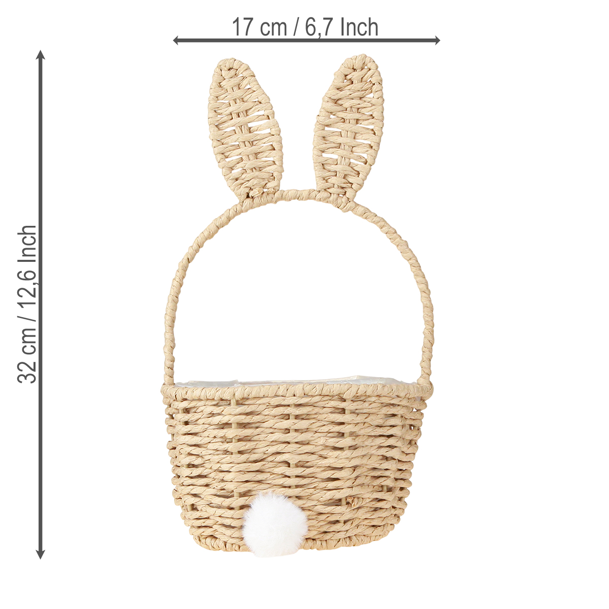 Šis Velykų krepšelis ne tik patrauks akį, bet ir bus neįtikėtinai praktiškas. 32 cm aukščio ir 17 cm skersmens, jame yra daug vietos Velykų kiaušiniams, saldumynams ar mažoms dovanėlėms. Išradinga dalis: krepšelis išklotas apsaugine folija, todėl idealiai tinka kaip vazonas. Įsivaizduokite, kaip žavingai atrodytų gležnų žolelių, mažų pavasario gėlių ar spalvingų kiaušinių derinys viduje. Natūrali rafijos medžiaga taip pat suteikia krepšeliui šiltą, kaimišką atspalvį. Dėl aukštos kokybės gamybos tai yra patvarus, rankų darbo dekoratyvinis elementas, kurį galite naudoti vėl ir vėl. Derinkite krepšelį su derančiomis natūraliomis dekoracijomis, tokiomis kaip medinės figūrėlės, žvakės ar maži keraminiai kiaušiniai, ir sukurkite harmoningą ansamblį, kuris džiugins. Šis Velykų krepšelis puikiai dera prie kaimiško ar bohemiško stiliaus dekoro.