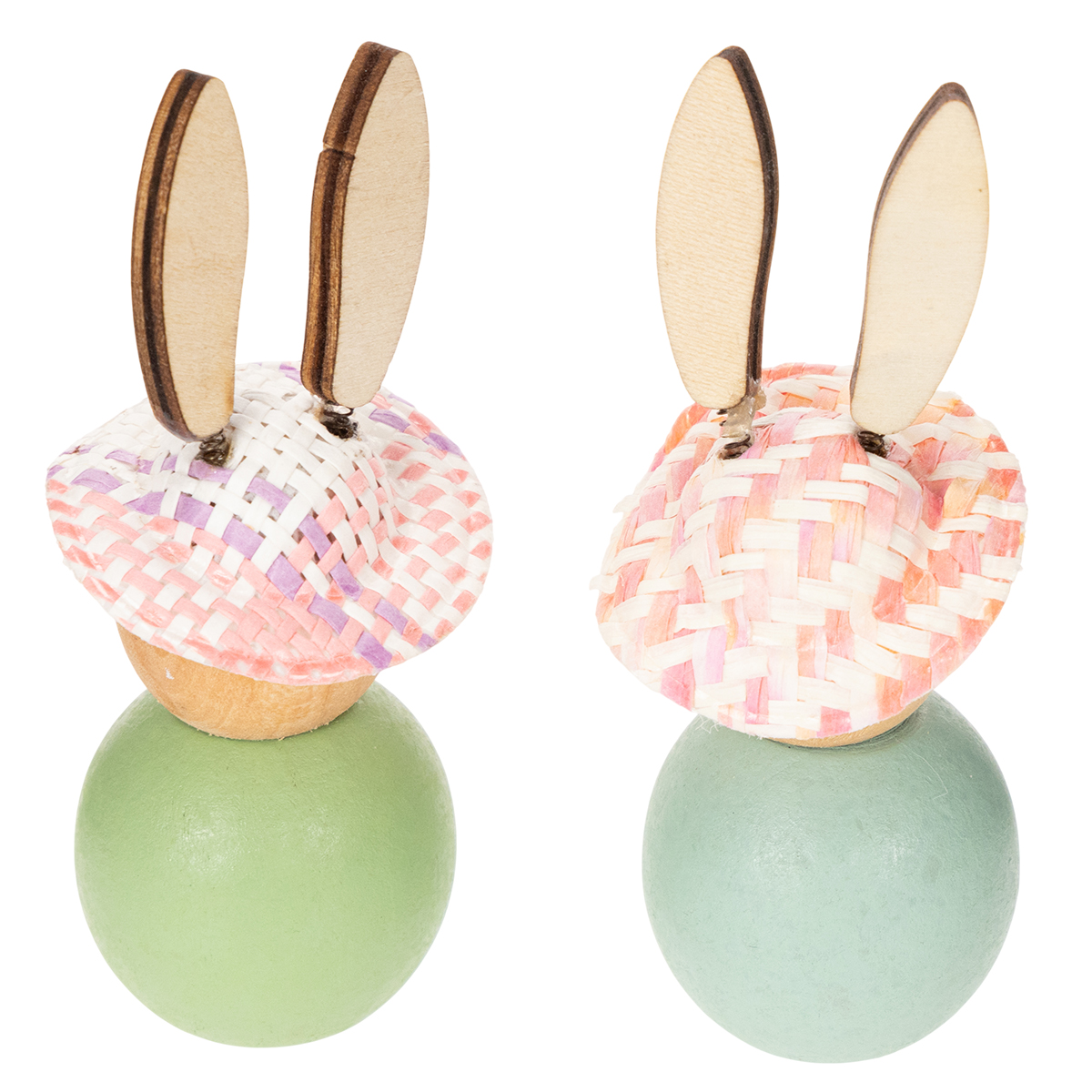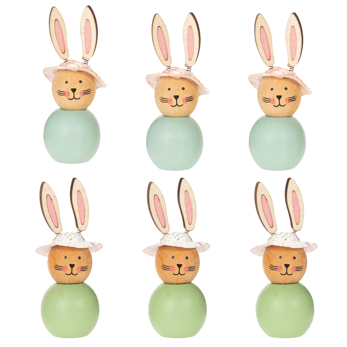 Šios medinės figūrėlės žavi savo natūraliu žavesiu ir linksmu patrauklumu: skaidri mediena, derinama su subtiliais žalios ir mėtinės spalvos atspalviais, susitinka su žaismingu dizainu. Ypač rožinės kepurėlės suteikia figūrėlėms stilingą vintažinį akcentą. Kiekvienas triušis yra maždaug 9 cm aukščio ir įneša į jūsų namus pavasario dvelksmą. Ant metalinių spyruoklių esančios ausys ne tik vizualiai įspūdingos, bet ir suteikia gyvumo, kuris tikrai patrauks akį.