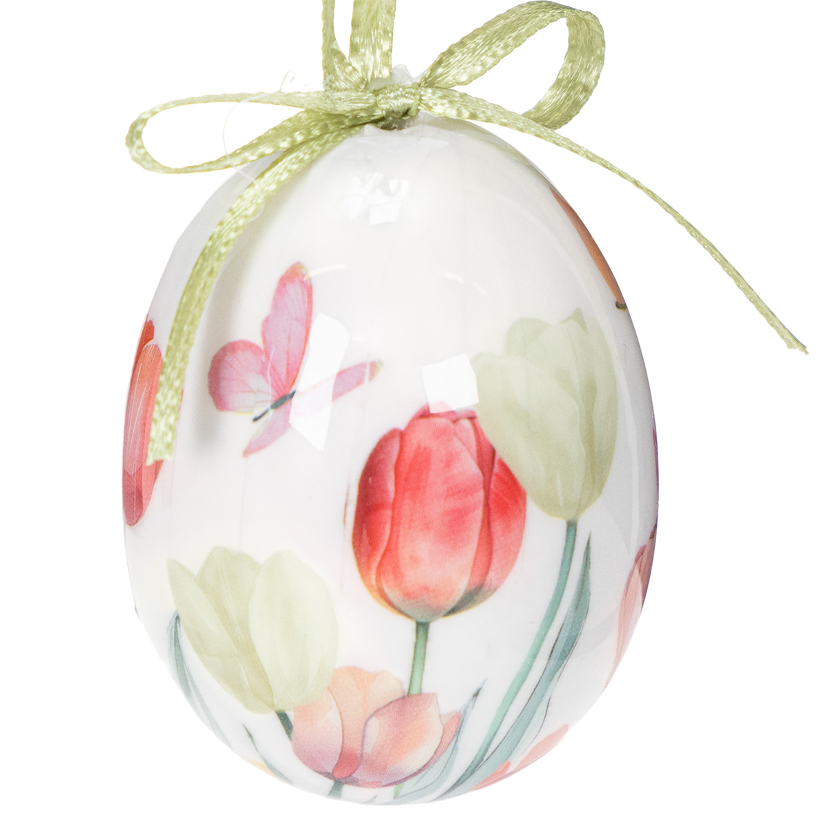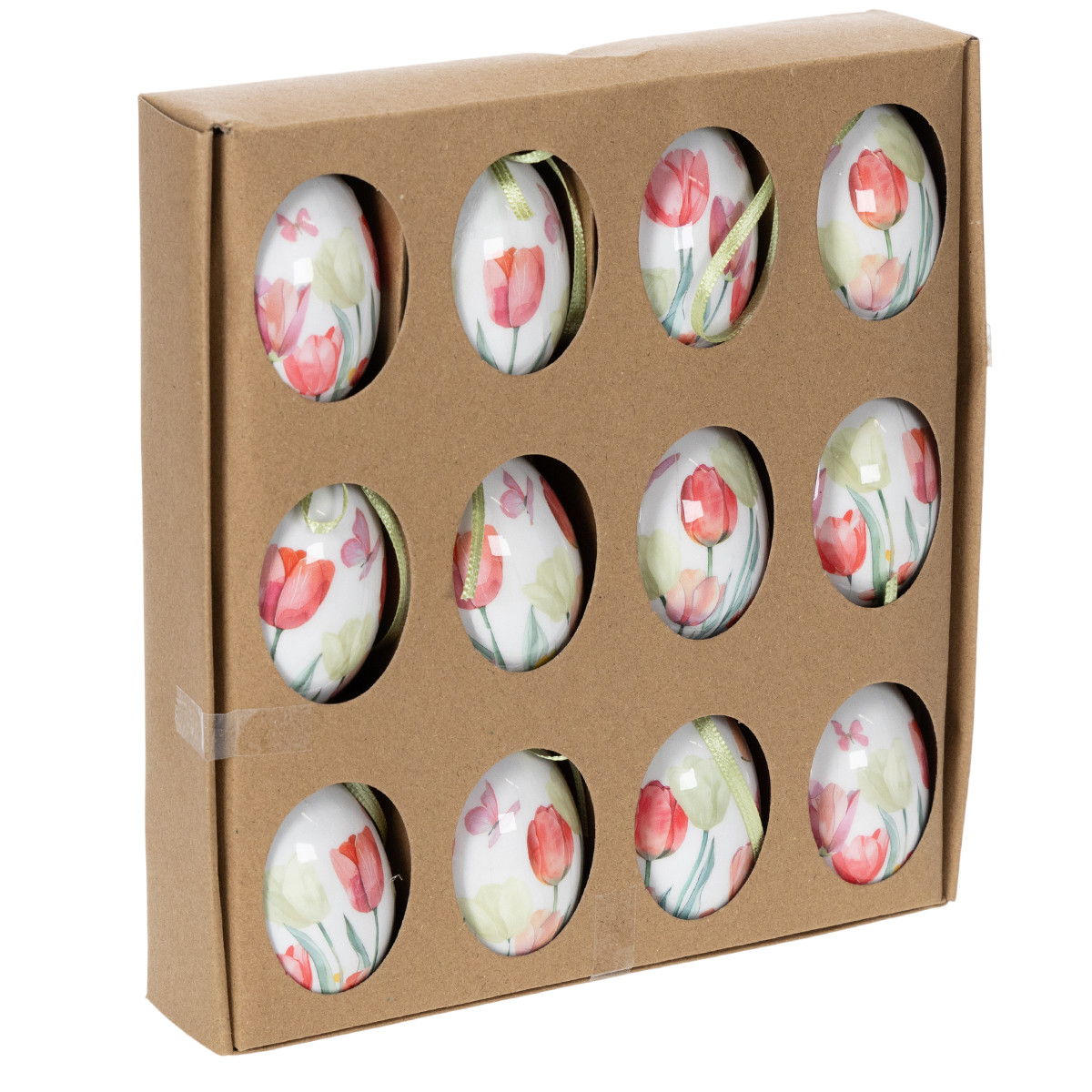 Velykinių kiaušinių dekoracija, tulpės motyvas su juostele pakabinimui ir pavasarinė dekoracija, 6 cm, 12 vnt.