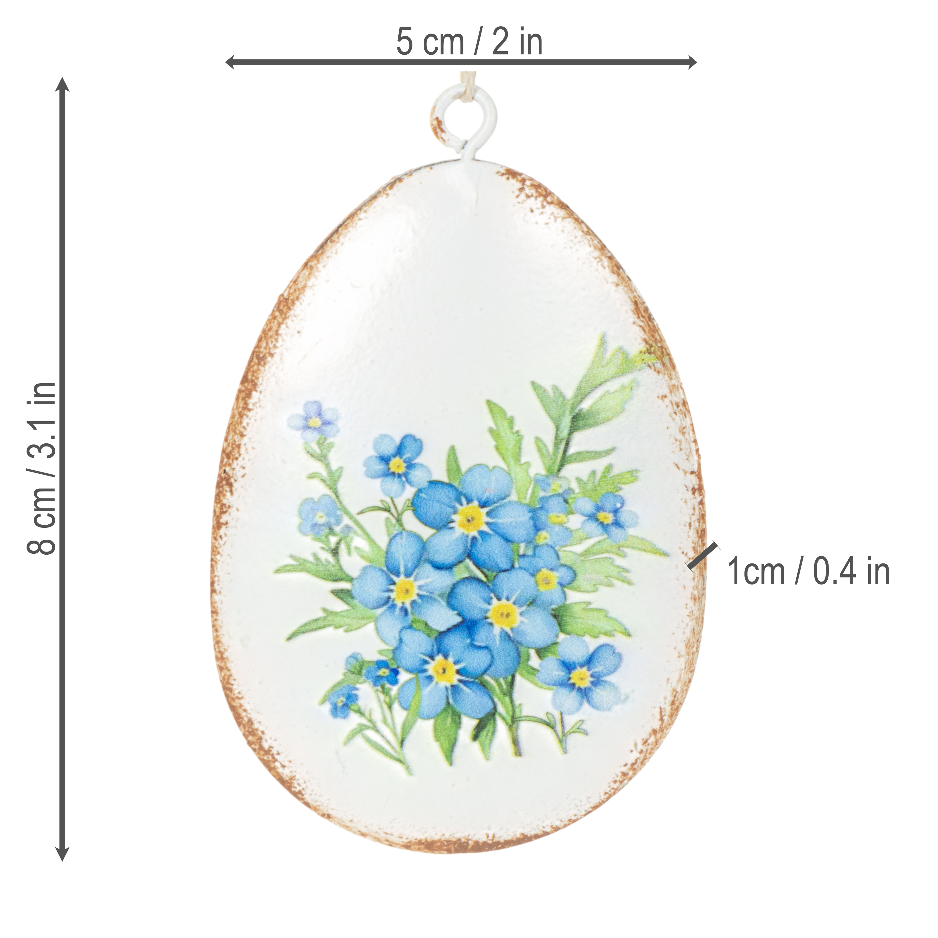 Šie dekoratyviniai metaliniai Velykų kiaušiniai stebina savo dydžiu ir išvaizda. 8 cm aukščio ir 5 cm skersmens, jie puikiai tinka įvairiems tikslams. Šiek tiek matinį baltą pagrindą papildo keturi skirtingi gėlių motyvai, kurie įkvepia pavasariui gyvybės: nuo subtilių neužmirštuolių iki ryškių narcizų. Subtilus vintažinis vaizdas daro juos ypač skoningais ir puikiai dera prie retro, „shabby chic“ ar kaimiško stiliaus dekoracijų.