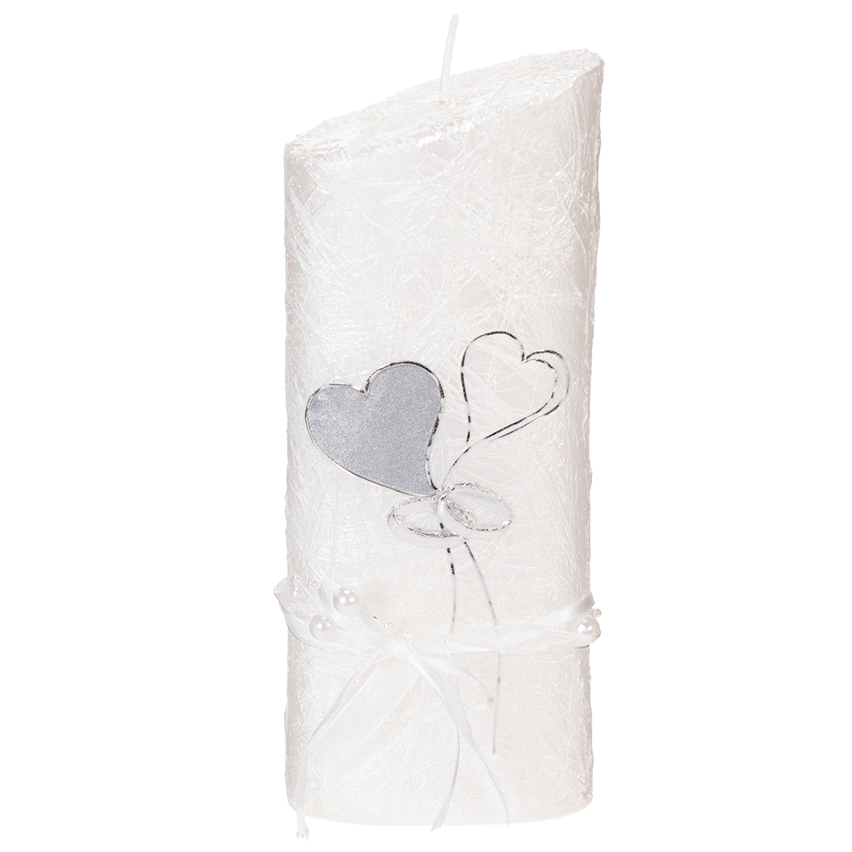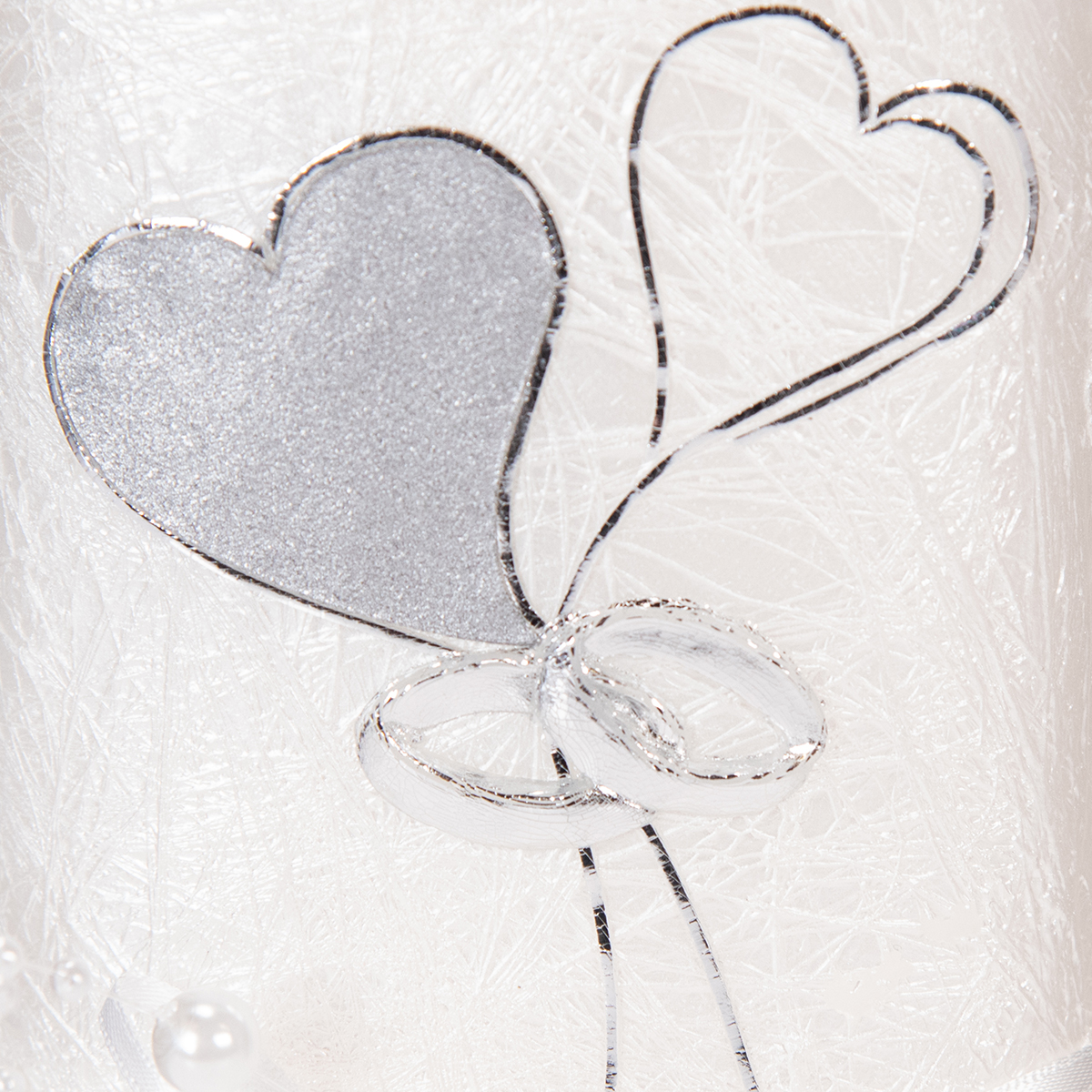 Ši elegantiškai žėrinti balta vestuvinė žvakė puikiai papildys jūsų stalo dekoracijas! Kadangi dizainas su žiedais ir širdelėmis yra sidabrinis, ši žvakė taip pat idealiai tinka sidabrinėms vestuvių metinėms.