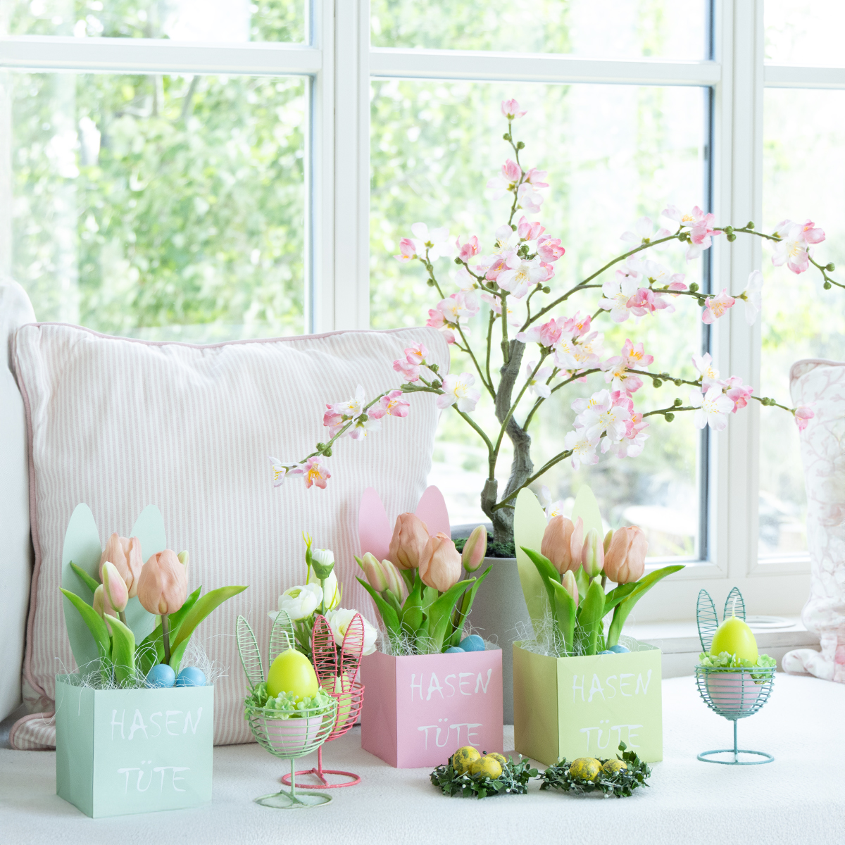 Šie 16 cm aukščio vieliniai zuikučiai ne tik suteikia jūsų namams žaismingumo, bet ir yra neįtikėtinai universalūs. Jų erdvus dizainas, pagamintas iš aukštos kokybės metalo, užtikrina, kad jie atrodo tvirti ir lengvi. Pasteliniai geltonos, rožinės ir žalios spalvos atspalviai puikiai dera su moderniais interjero stiliais – nuo minimalistinio iki žaismingai pavasariško. Ypač praktiška savybė: zuikučiai yra atviri, todėl galite juos užpildyti kuo tik norite. Nesvarbu, ar tai maži šokoladiniai kiaušiniai, spalvingos plunksnos, ar net subtili LED lempučių girlianda – juos galima pritaikyti pagal jūsų idėjas. Norėdami natūralesnio vaizdo, galite juos užpildyti samanomis ar džiovintomis gėlėmis, kad sukurtumėte unikalų Velykų peizažą. Naudokite zuikučius kaip ypatingą stalo puošmeną savo Velykų priešpiečiams arba kaip žavingą staigmeną ant palangės: jūsų svečiai bus sužavėti! Ar mėgstate kūrybiškus „pasidaryk pats“ projektus? Tuomet pabandykite derinti vielinius zuikučius su gėlėmis iš savo floristikos reikmenų. Panašios dekoracijos iš tos pačios spalvų šeimos tinka geriausiai – išbandykite!