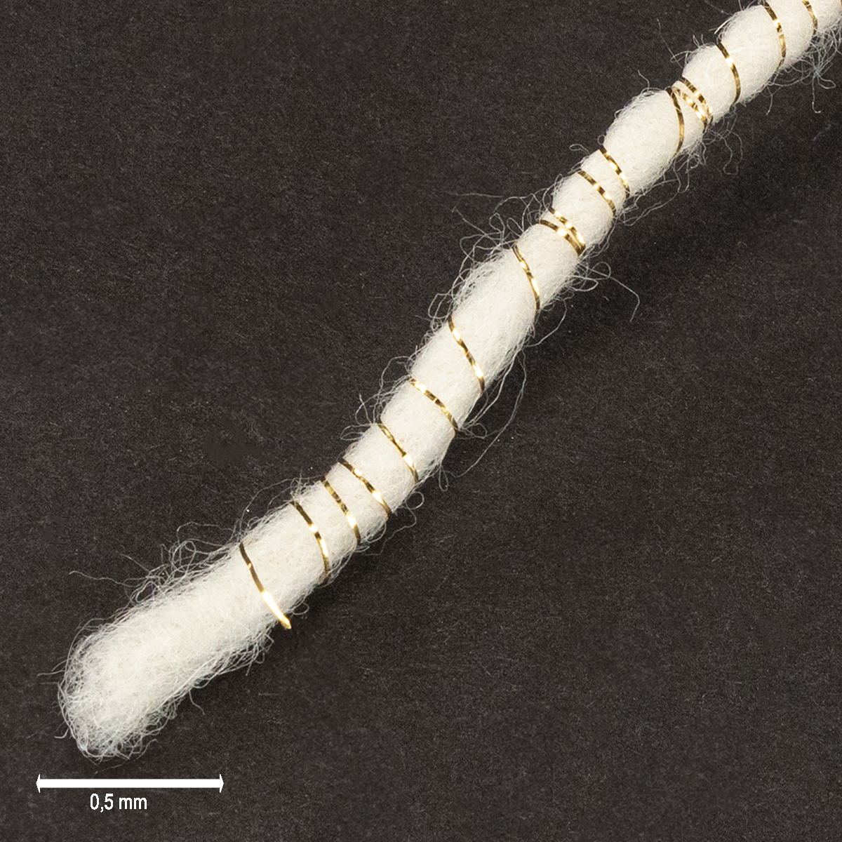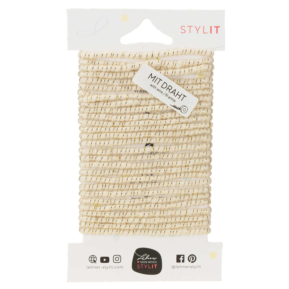 Produkto pavadinimas: Vilnonė virvelė, balta, su auksiniais siūlais, 5 m x 5 mm, su viela dekoravimui ir rankdarbiams