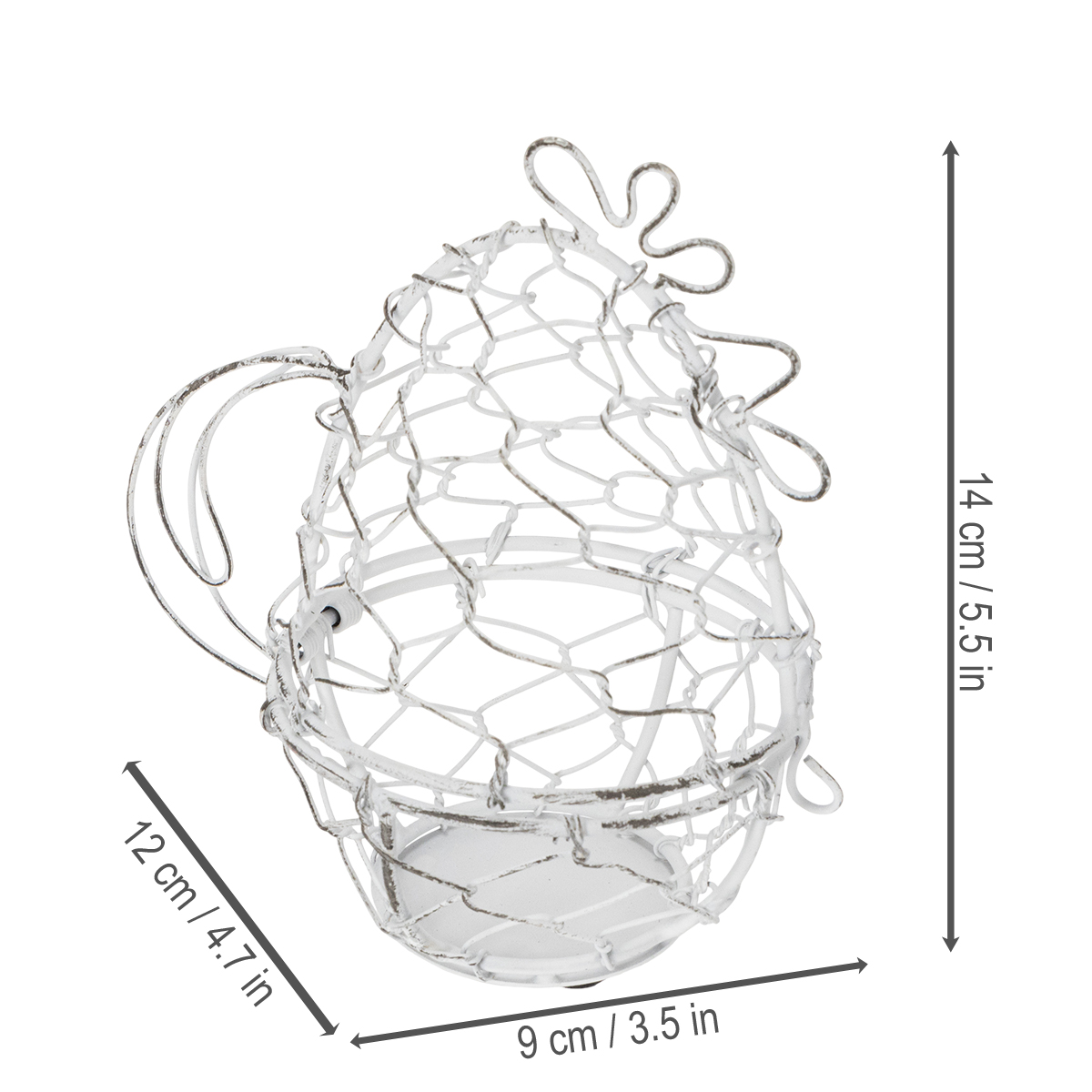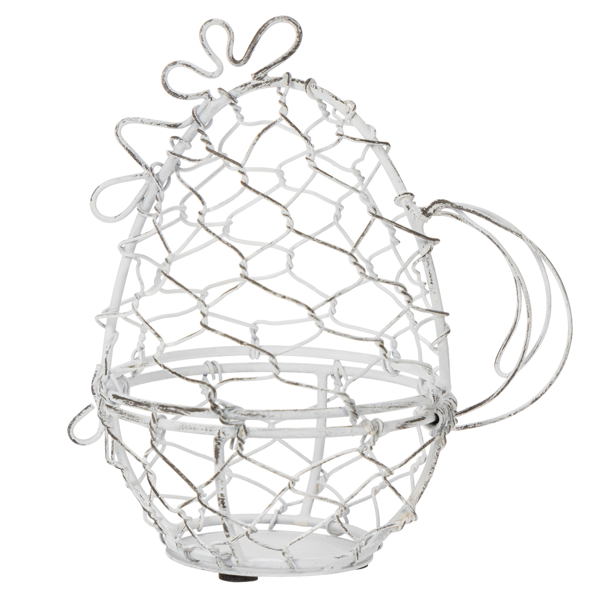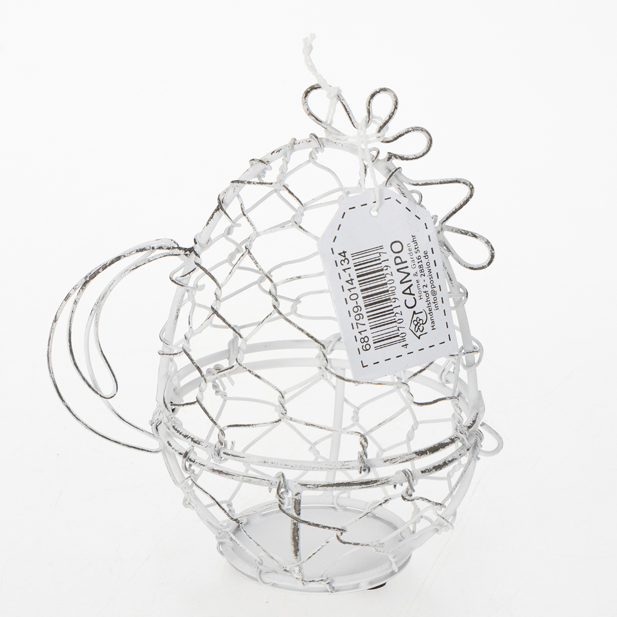 Šis vištos formos vielinis krepšelis ne tik traukia akį, bet ir yra itin praktiškas. 14 cm aukščio ir 12 cm skersmens, jis puikiai tinka jūsų Velykų kiaušiniams. Tvirta balto metalo konstrukcija paryškina žavingą „shabby chic“ stilių, kuriame dera santūri elegancija ir kaimiškas stilius. Nesenstantis dizainas dera prie įvairių interjero stilių – nuo kaimiško ir vintažinio iki modernaus.
