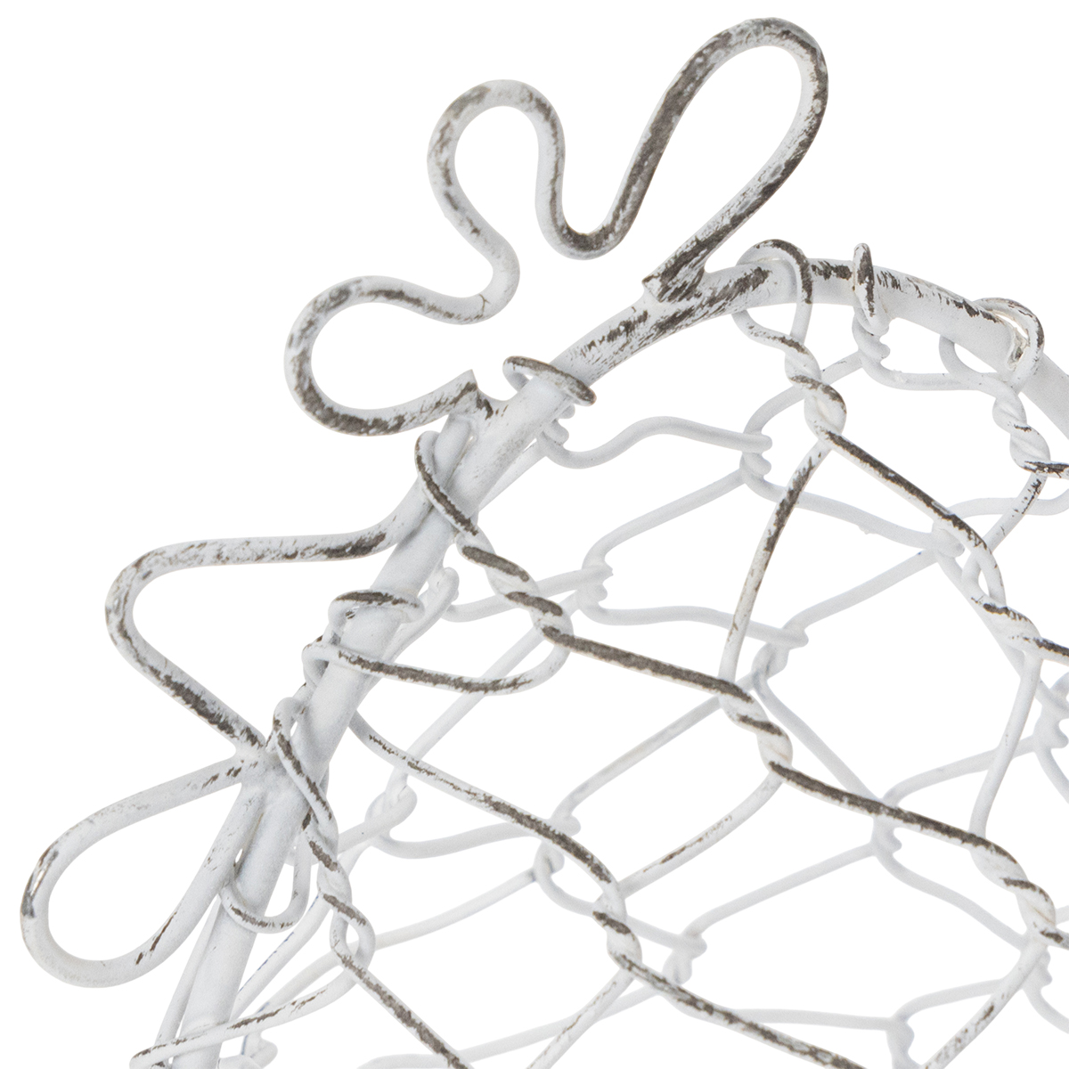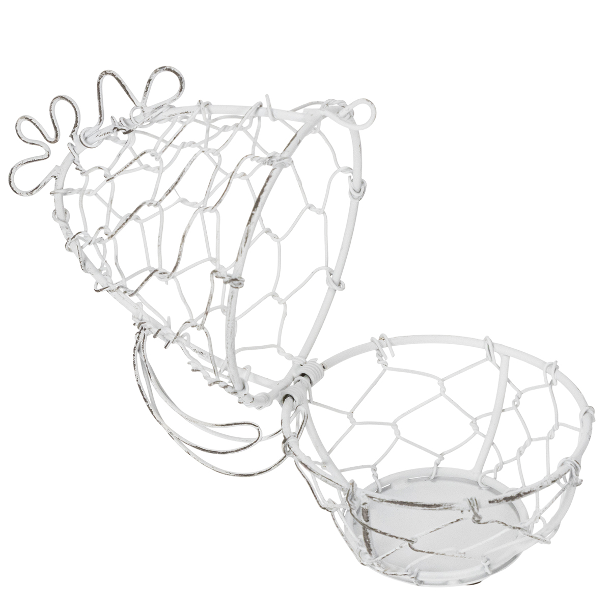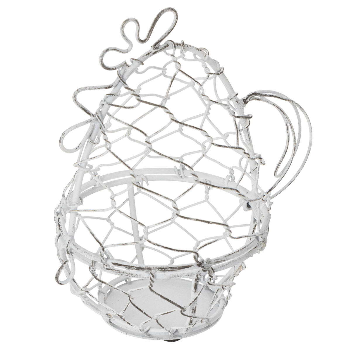 Šis vištos formos vielinis krepšelis ne tik traukia akį, bet ir yra itin praktiškas. 14 cm aukščio ir 12 cm skersmens, jis puikiai tinka jūsų Velykų kiaušiniams. Tvirta balto metalo konstrukcija paryškina žavingą „shabby chic“ stilių, kuriame dera santūri elegancija ir kaimiškas stilius. Nesenstantis dizainas dera prie įvairių interjero stilių – nuo kaimiško ir vintažinio iki modernaus.